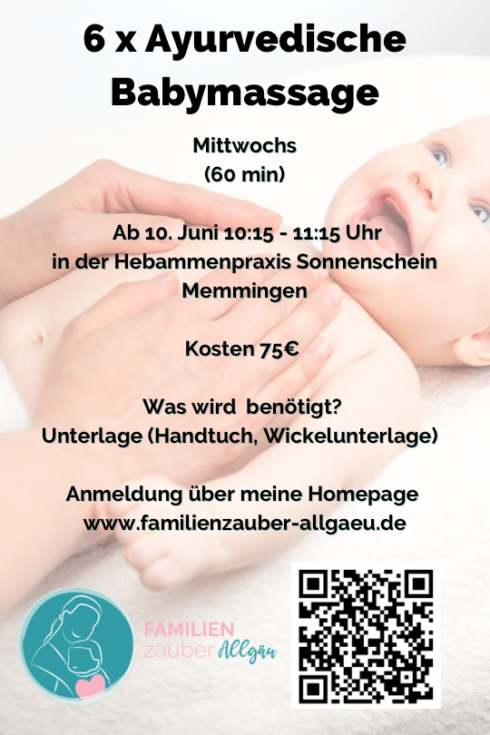 Ich freue mich darauf, dich und dein Baby auf eurem individuellen Weg zu unterstützen und zu begleiten. Kontaktiere mich gerne, um mehr über meine Angebote zu erfahren und einen Termin zu vereinbaren. Außerdem biete ich regelmäßig verschiedene Kurse und Workshops zu den obigen Themen in der Hebammenpraxis Sonnenschein in Memmingen an. Termine findest du weiter unten.